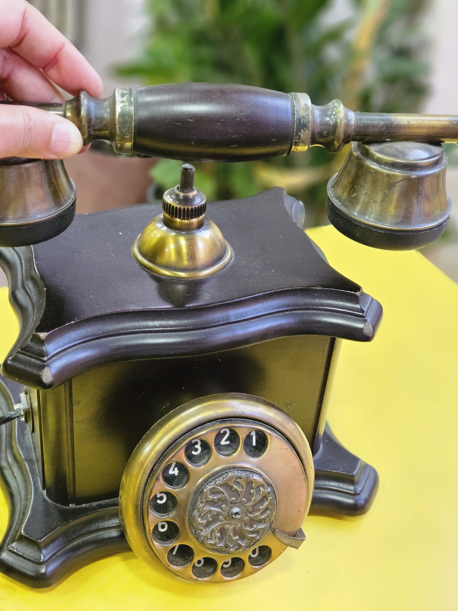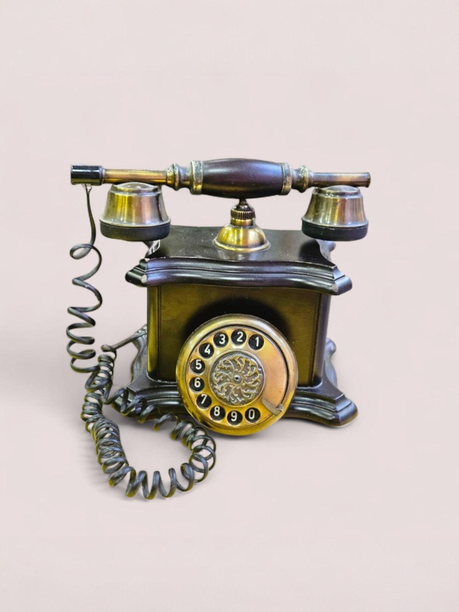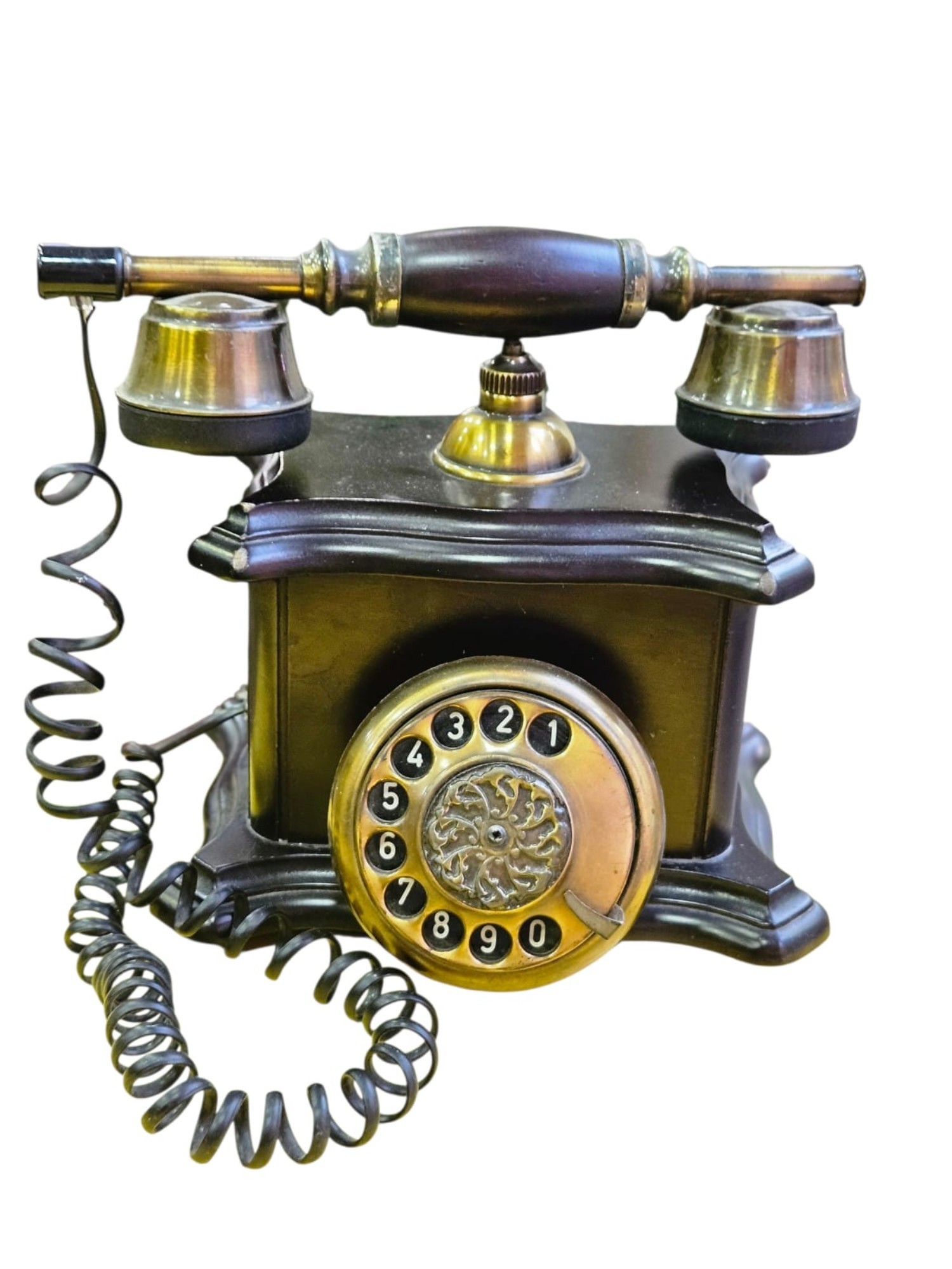 Bu nostaljik döner kadranlı telefon, 1900’lü yılların başından esinlenen klasik bir tasarıma sahiptir. . Ahşap ve pirinç gövdesiyle dekoratif bir zarafet sunar. . Orijinal dönem estetiğini yansıtan bu model, hem koleksiyonluk bir üründür hem de vintage dekorasyonlarda göz alıcı bir unsurdur. Bu parça dekorasyon amaçlı kullanıma uygundur ve işlevi test edilmemiştir.