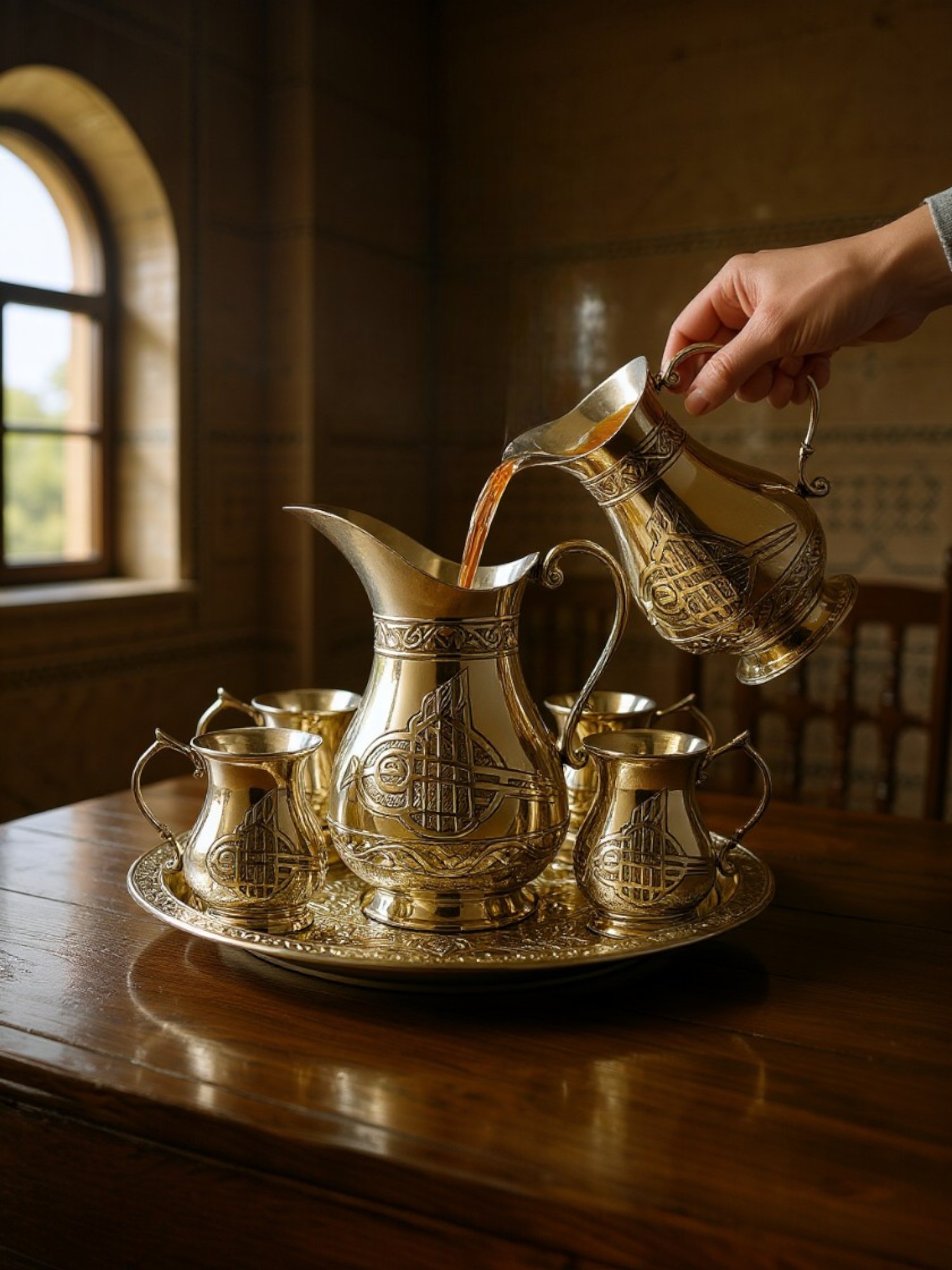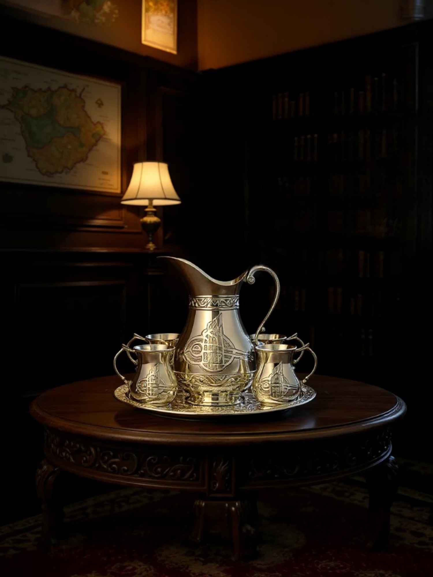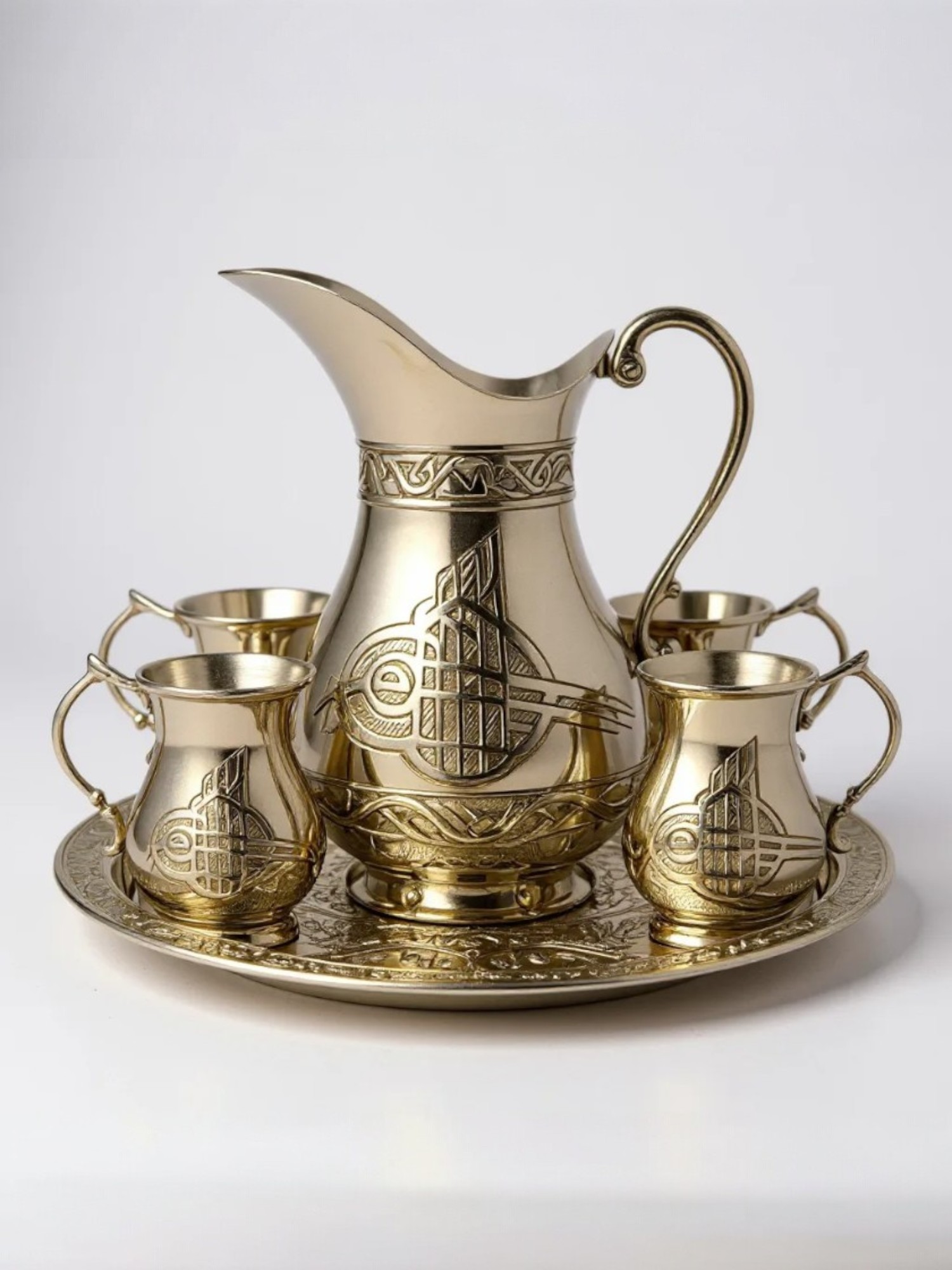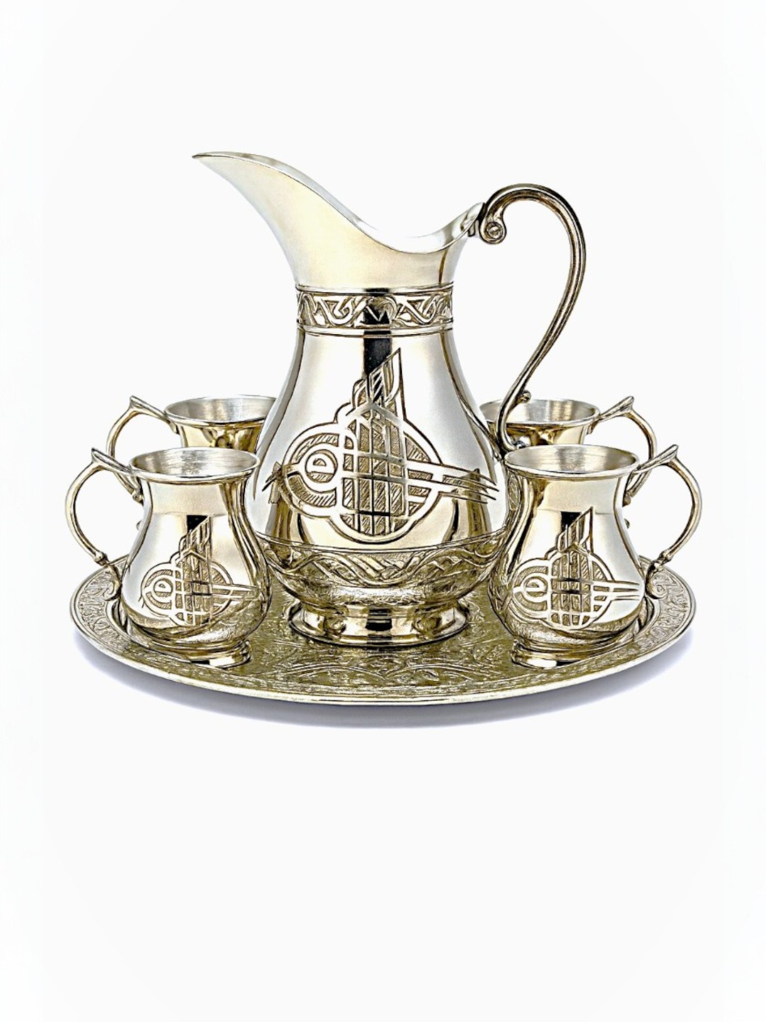 Nikel kaplamalı, kalay kaplı bu zarif bakır ayran seti, geleneksel Osmanlı motifleri ve el yapımı detaylarla dekore edilmiş olup sofralarınıza miras ve zarafet katıyor. Set, 1 adet oymalı sürahi, 6 adet kulplu fincan ve 1 adet dekoratif tepsiden oluşuyor.