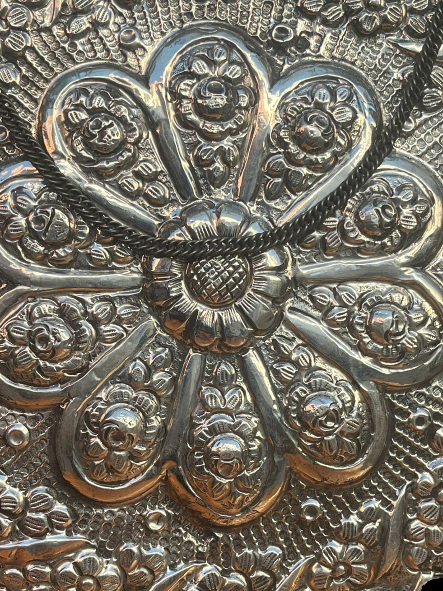 Aynanın çerçevesi ve arkası tamamen el işçiliğiyle repoussé tekniği kullanılarak üretilmiştir.